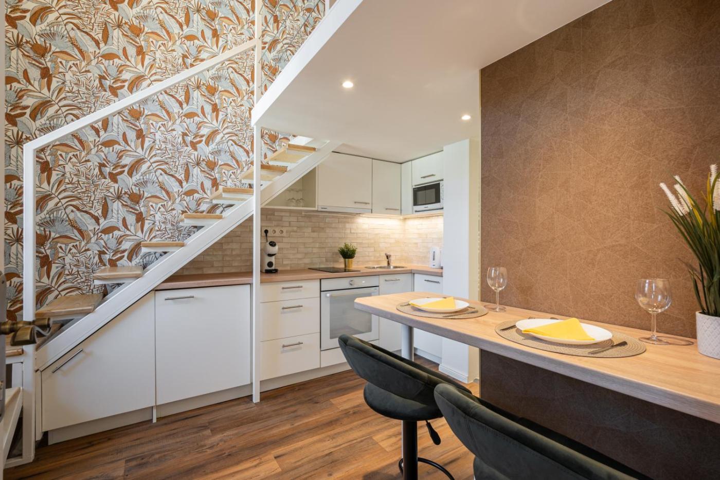 Studio. The studio offers air conditioning, soundproof walls, as well as a private bathroom boasting a shower and a hairdryer. In the well-fitted kitchen, guests will find a stovetop, a refrigerator, an oven and a microwave. The studio features a coffee machine, a dining area, heating and a flat-screen TV. The unit has 1 bed. ;